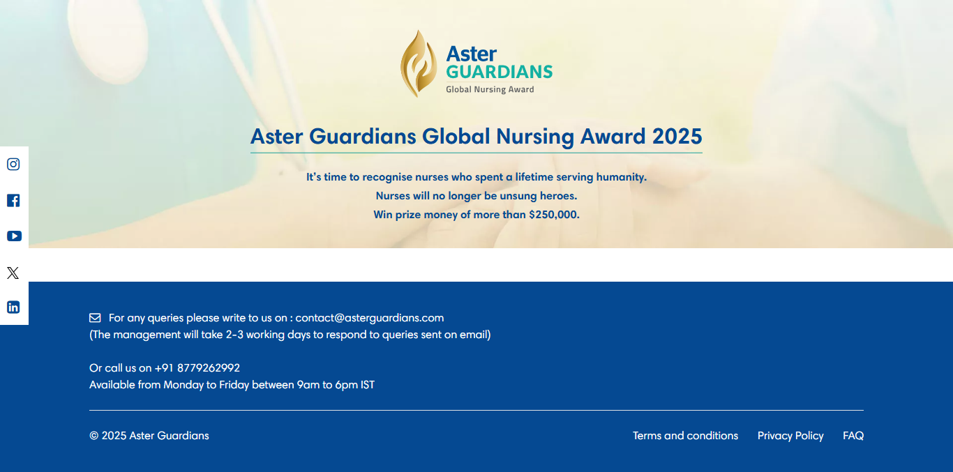 https://apply.asterguardians.com/Aster Guardians, an initiative by Aster DM Healthcare, celebrates and recognizes outstanding contributions in nursing across its global network. With nominees spanning multiple countries, Aster Guardians required a robust digital platform to manage registrations, submissions, and multi-round jury evaluations—all while reflecting the brand’s commitment to quality care.